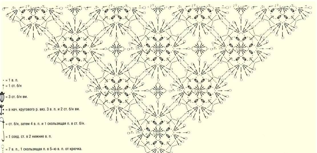 Размеры треугольной шали — 180х90 (меняются в зависимости от потребностей), материал — хлопчатобумажная или полушерстяная пряжа в три сложения, крючок №4,5. Платок начинают вязать с нижней части с 3 воздушных петель, постепенно расширяясь кверху. Боковые стороны обычно украшают кистями или бусинами.