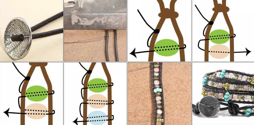 Плотную нить длиной примерно 2 м складываем пополам и привязываем несколькими узлами к одному из концов кожаного шнура. Берем первую бусину и нанизываем ее на нить, согласно схеме плетения. Оборачиваем нить вокруг второго шнура и снова ведем через бусину. Таким нехитрым методом плетем весь браслет. Зафиксировав последнюю бусину, делаем два узла из концов кожаного шнура.