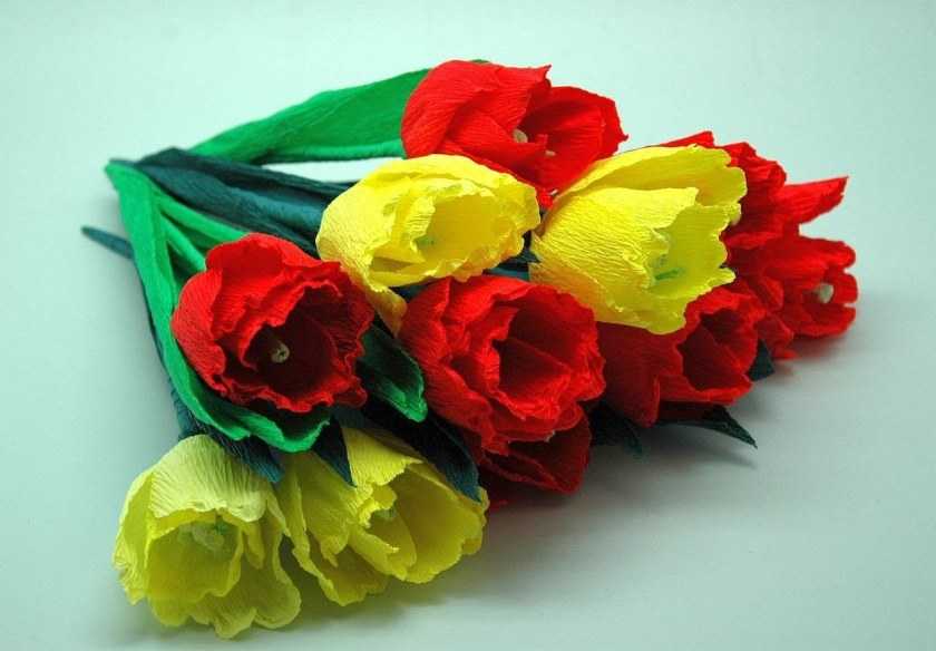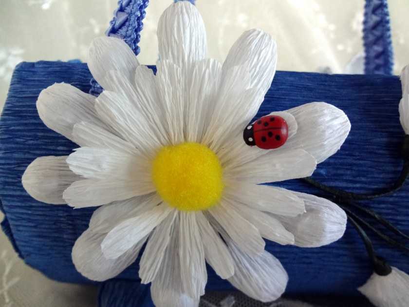 Теперь из цветной гофрированной бумаги вырезают отдельные лепестки и собирают в розочку на деревянной зубочистке. Такими розочками покрывают все туловище и голову сказочного слоника. Уши и подошву лап делают из картона. Поделка готова.