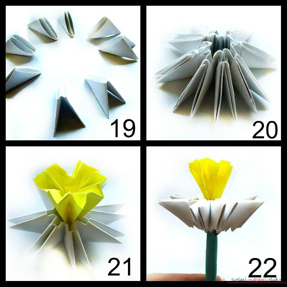 Среди цветов самой простой считается ромашка. Она может быть не только белой, но и полихромной, всё зависит от фантазии автора. Наибольшей популярностью у новичков пользуются модели с пятью лепестками. Для них понадобится всего 210 модулей.