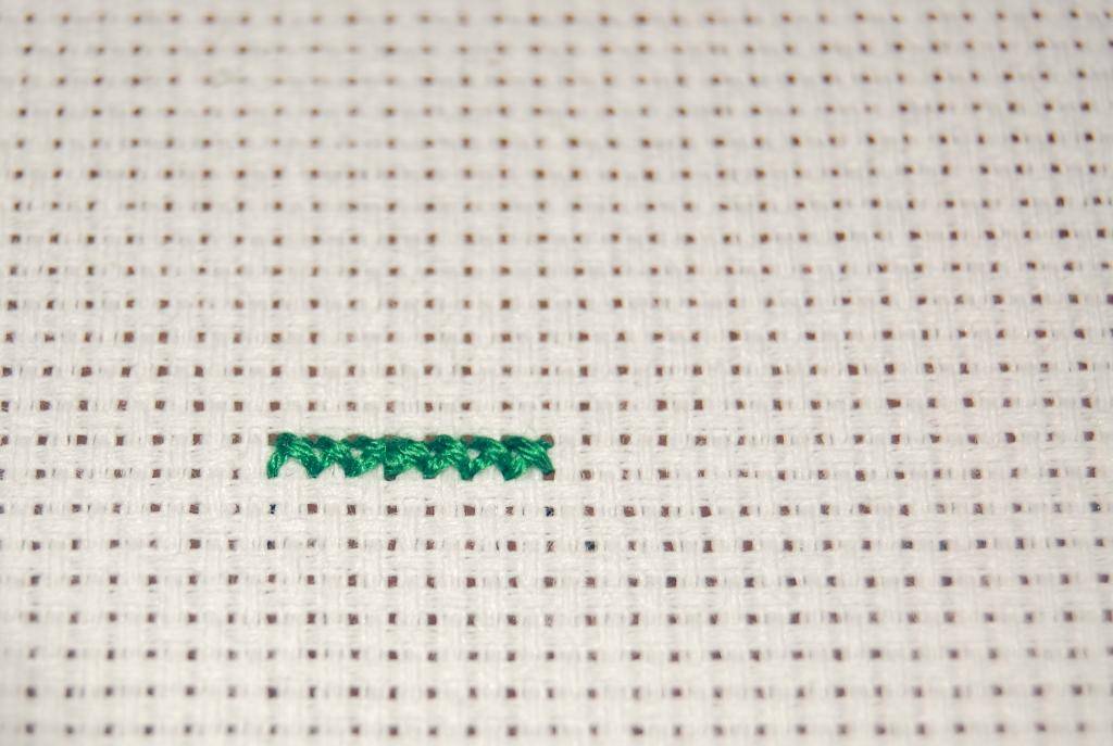 - Выводим нить в нижний правый угол по лицевой стороне. Вытягиваем на изнанку. Перед глазами возникает наклонный стежок.