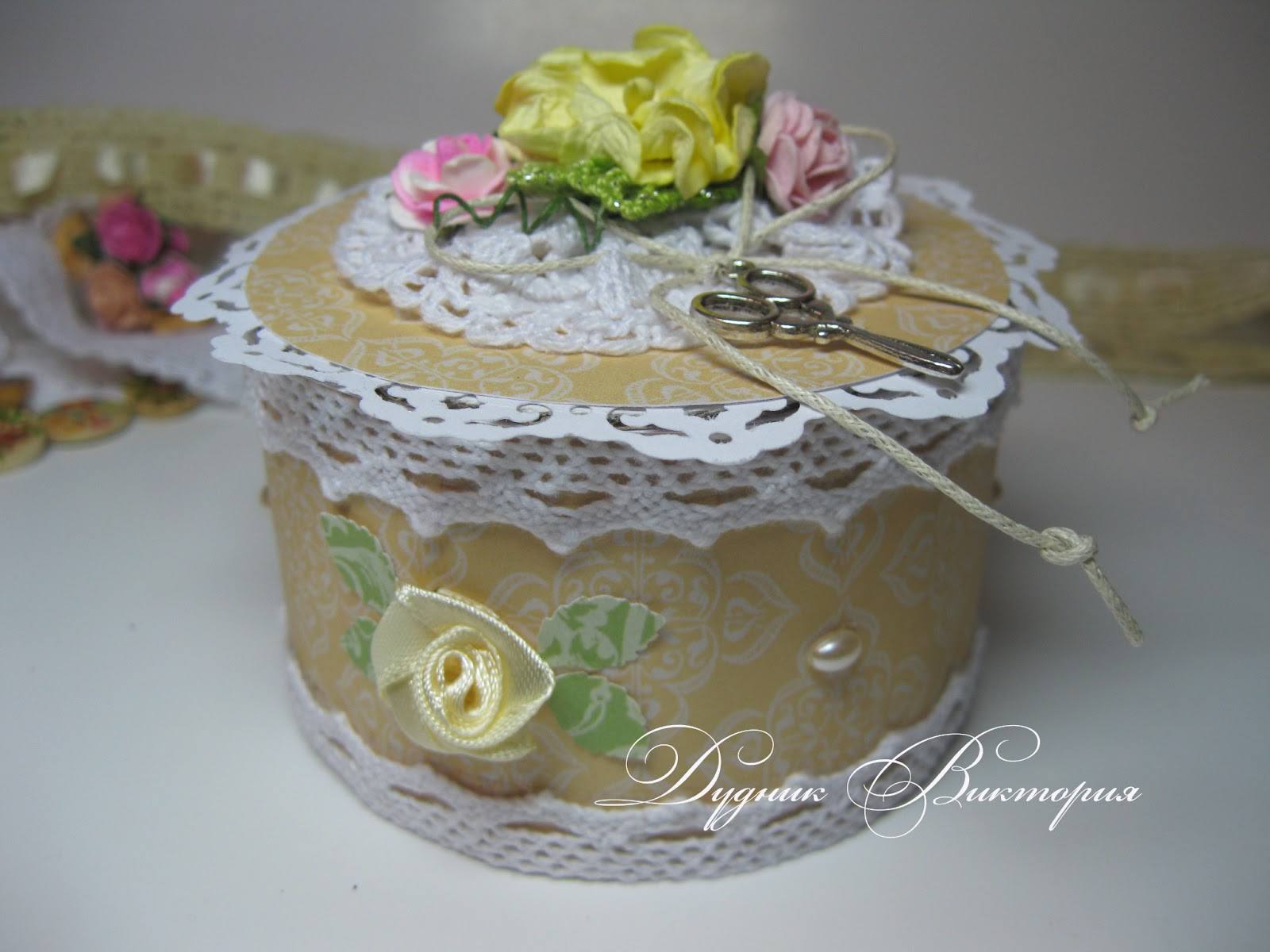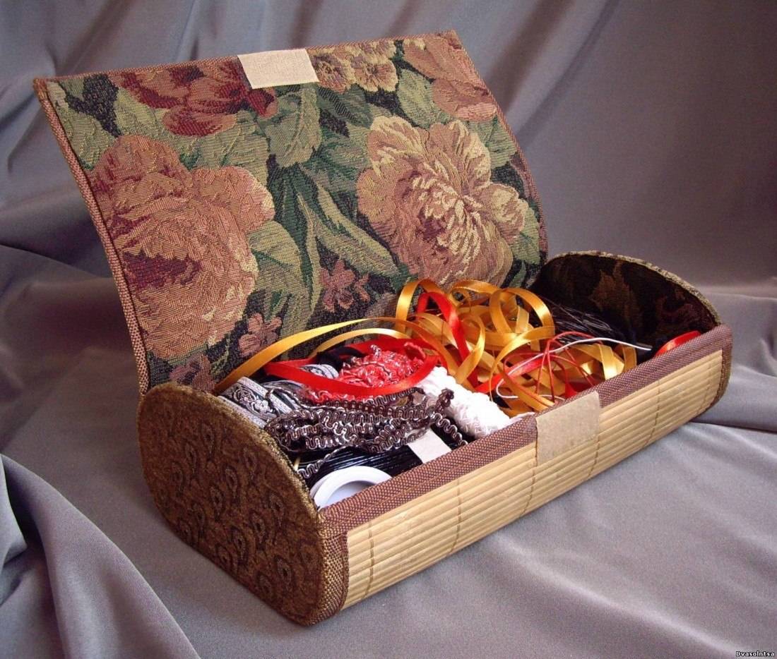 Обязательно делают запас материала, чтобы им удобно было обшить крышку шкатулки. После изделие декорируют бусинами, лентами, кружевом.