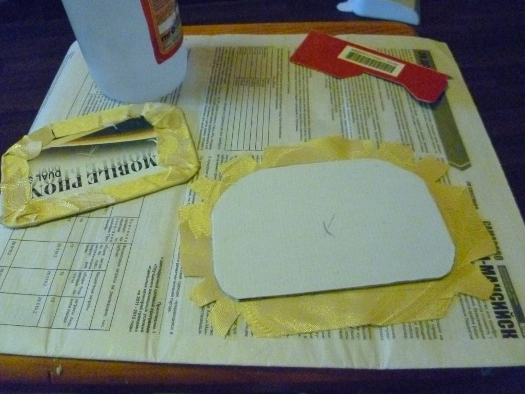 - крышка обтягивается так же, но к её внутренней части приклеивается текстильная петелька и широкая короткая лента;