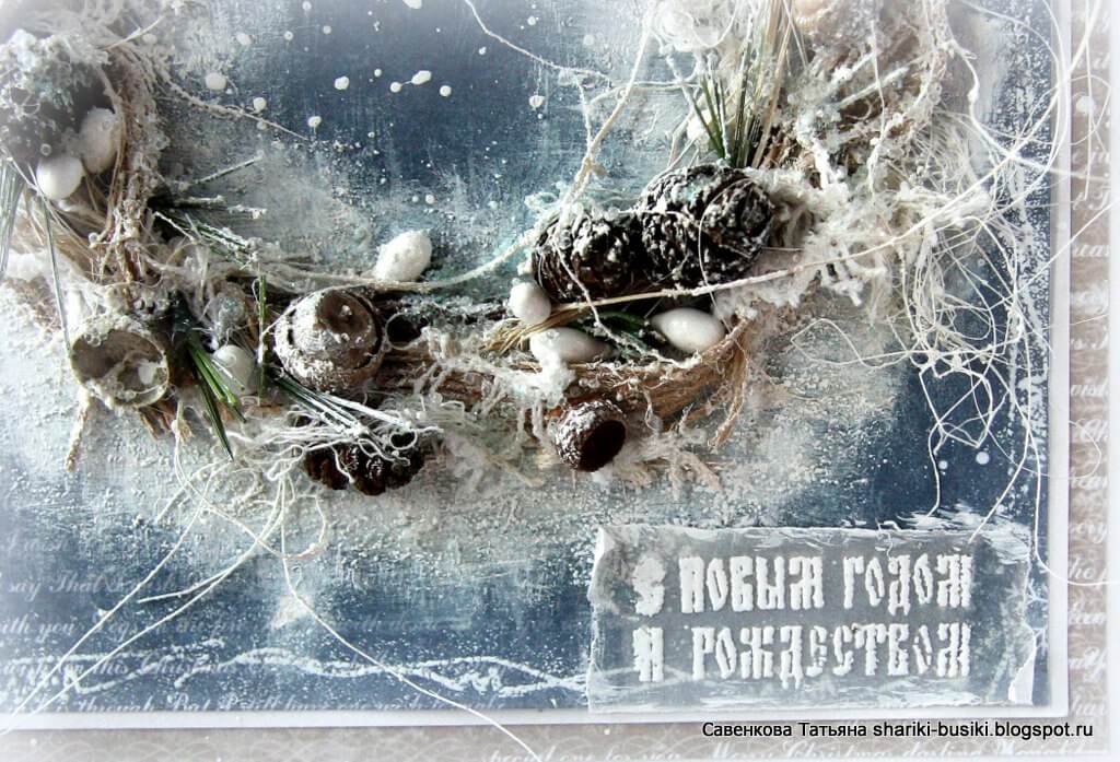 Новогодние открытки в технике скрапбукинг могут быть сделаны так: