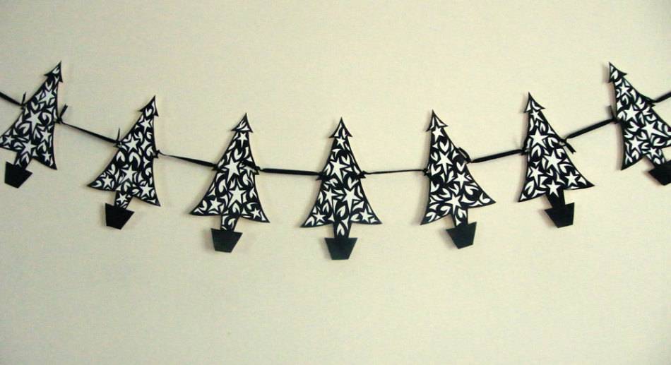 готовая бумажная гирлянда из вырезанных елок на стене