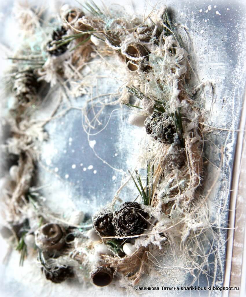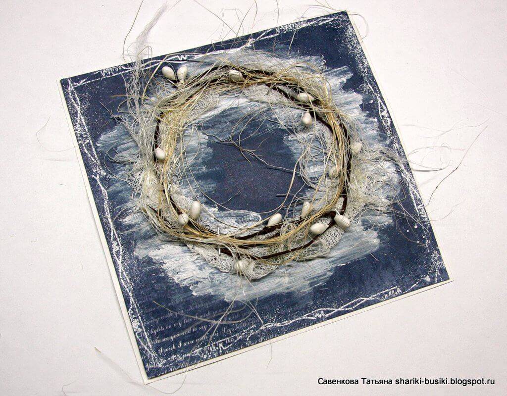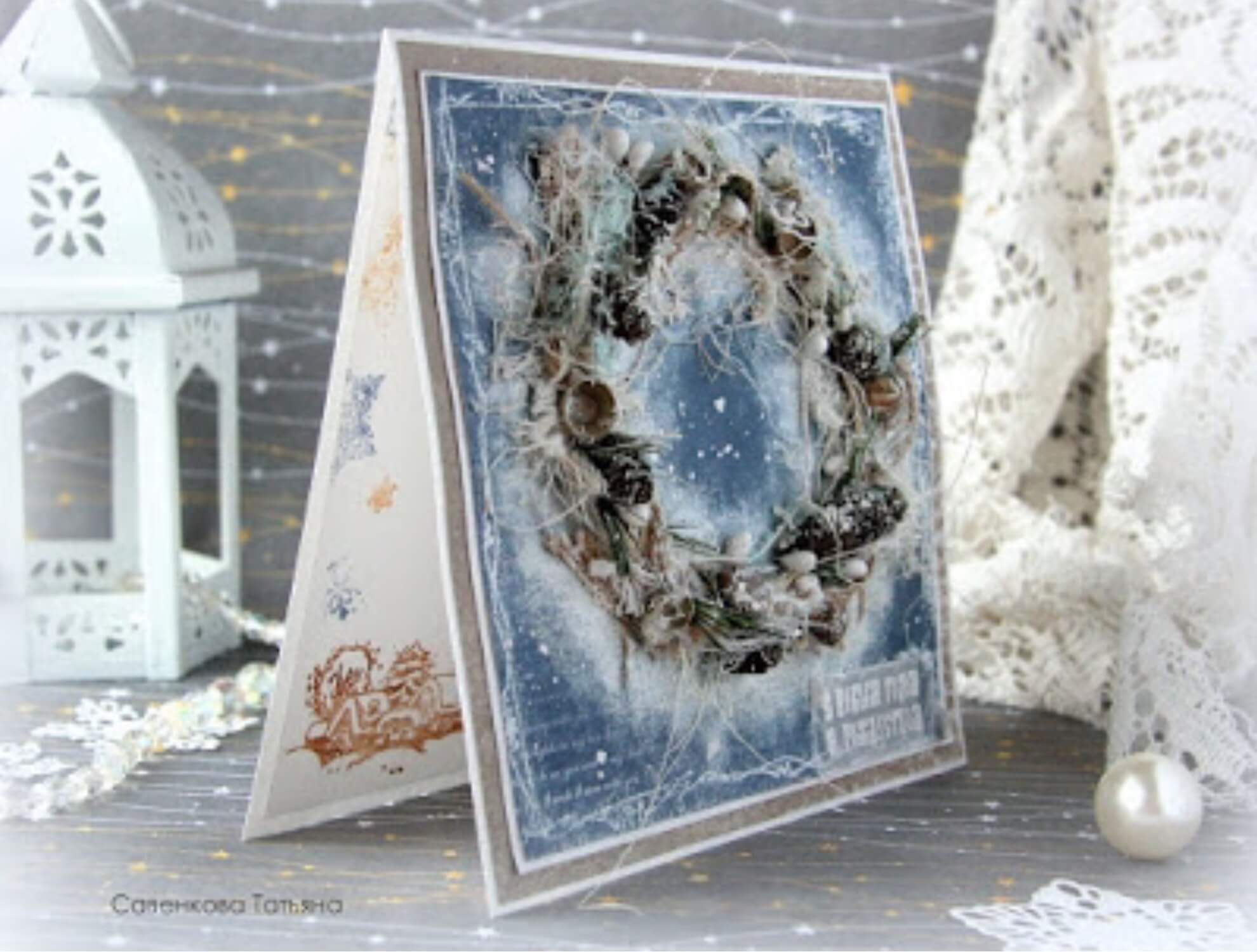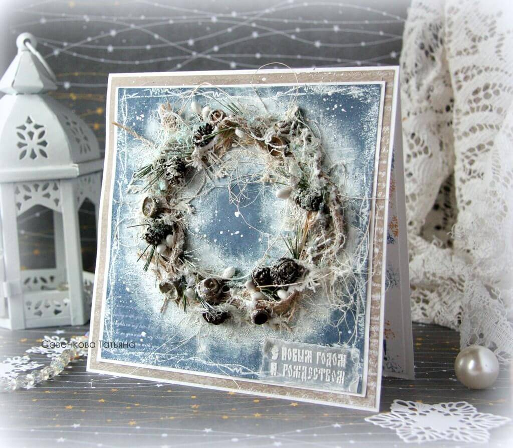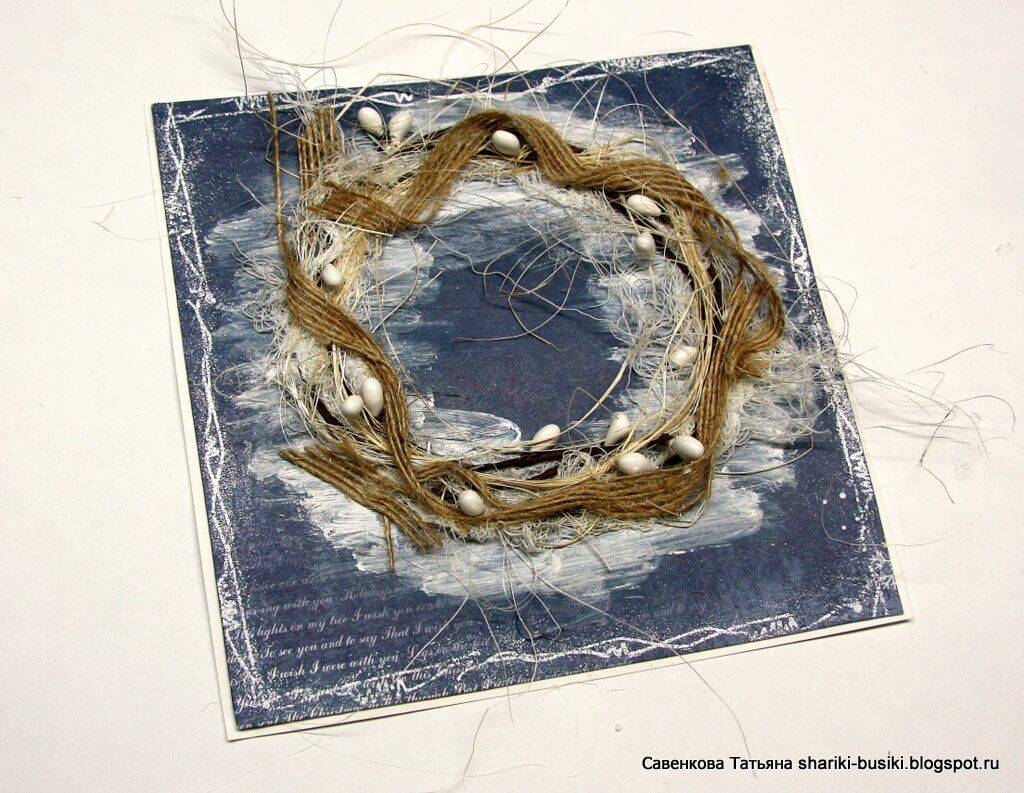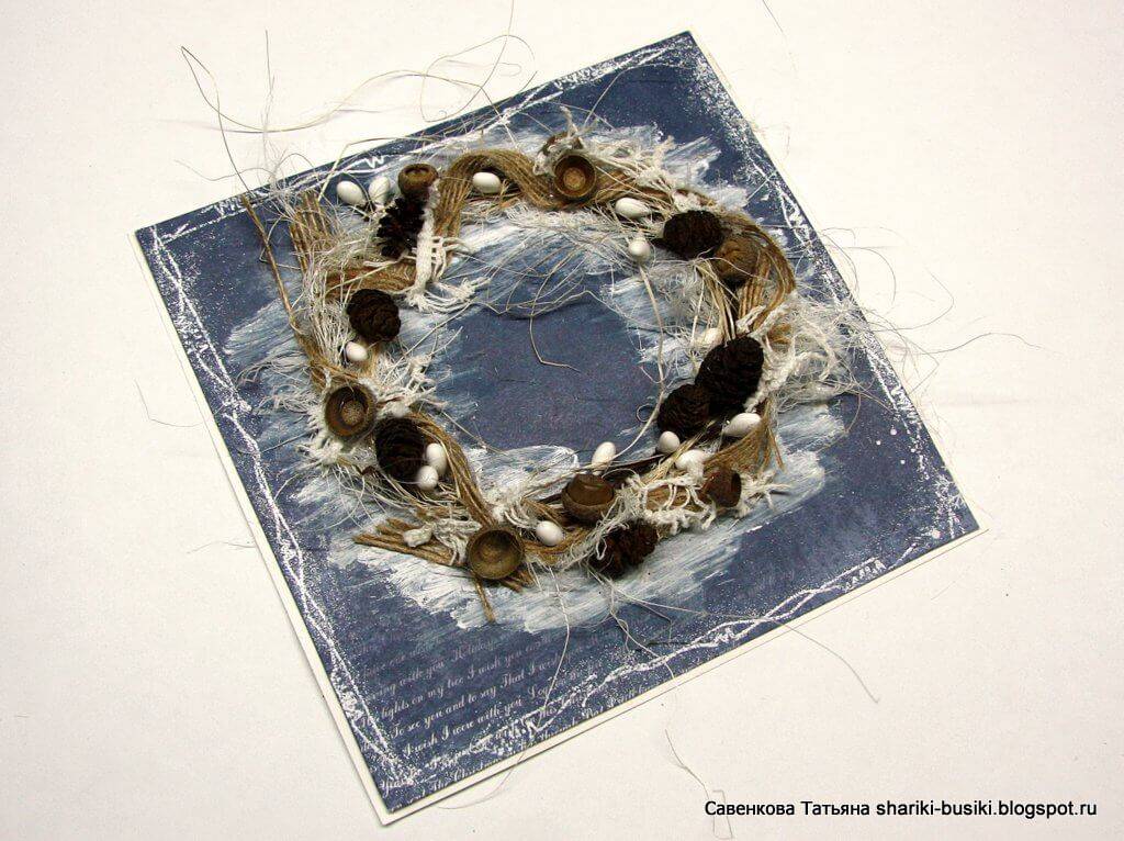 В этой открытке главное — изготовление венка, а дальше — уже ваша фантазия и воображение. Смотрим мастер-класс и пробуем сделать красивую открытку.