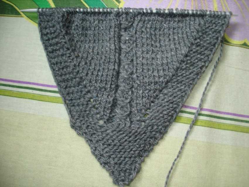 Далее вяжем лицевой гладью до мыска 12,5 см (38 рядов).