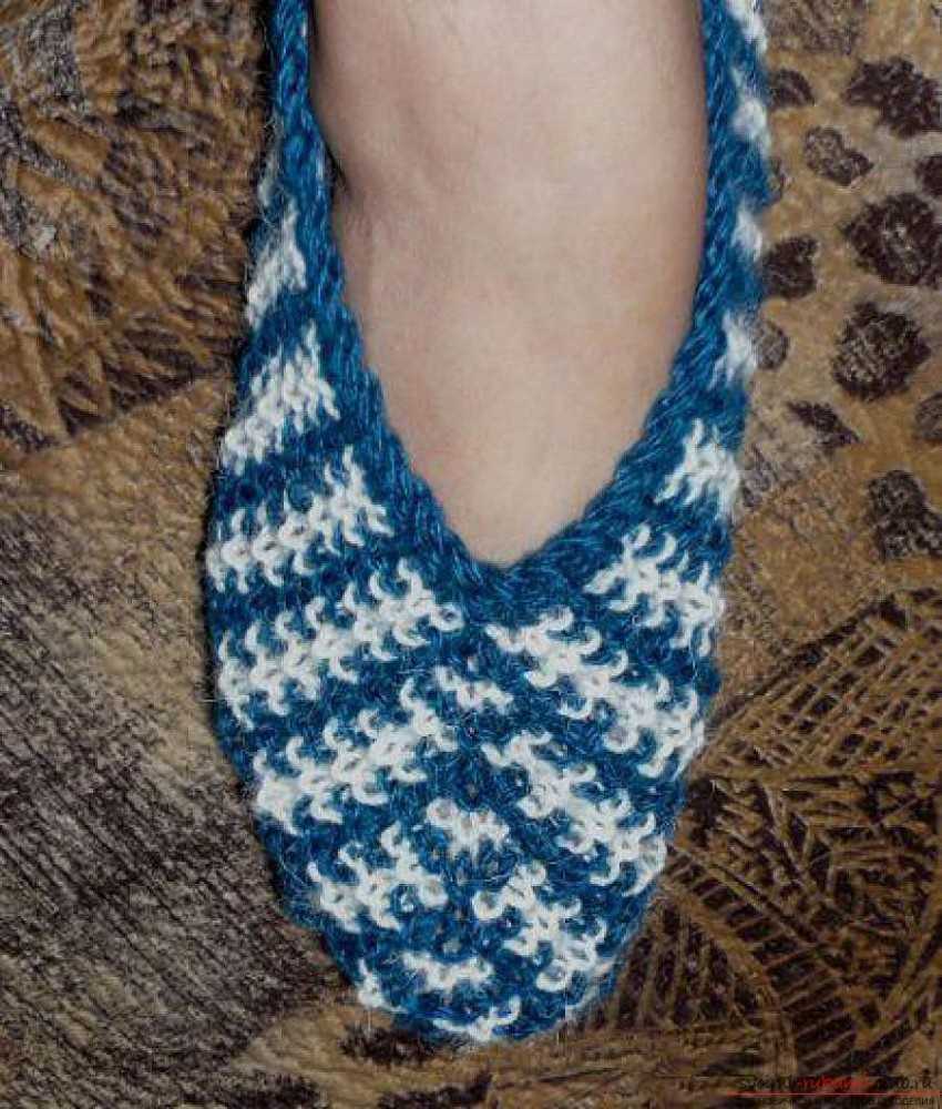 Для более длительной носки, вяжите домашние тапочки на двух спицах в две нити, при этом для вывязывания пятки можно добавить синтетику.