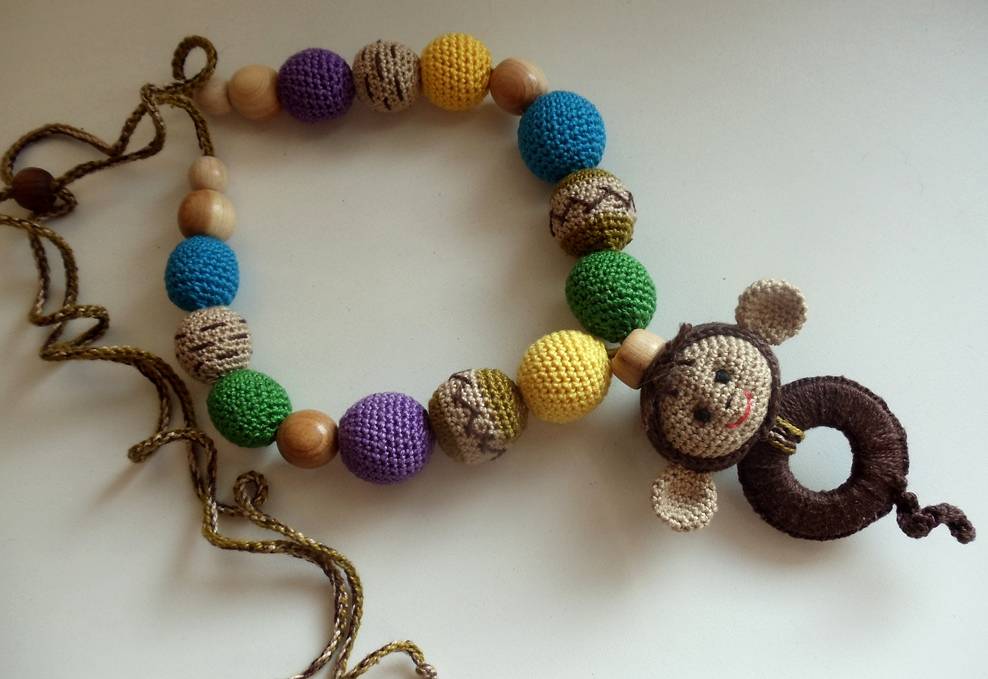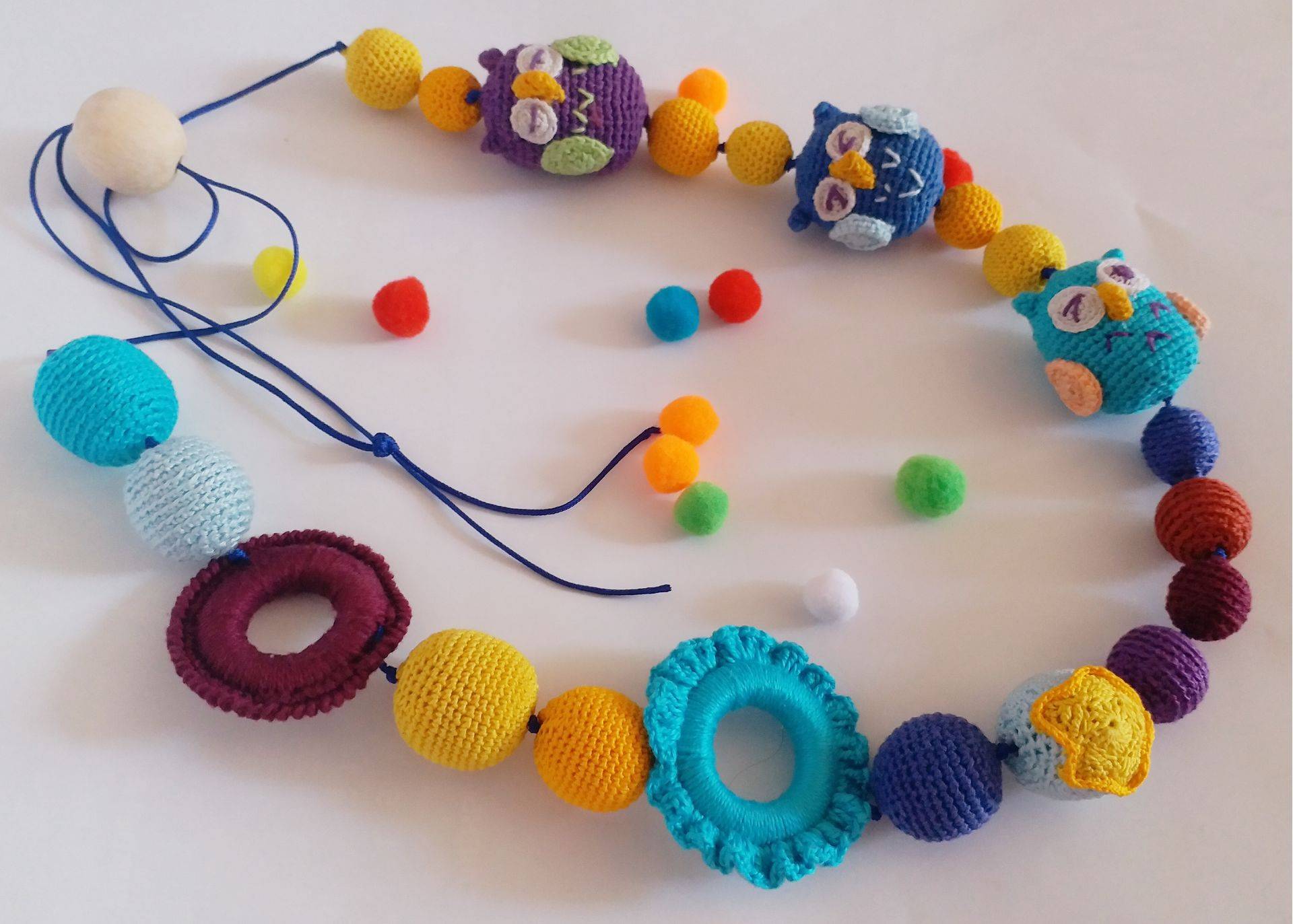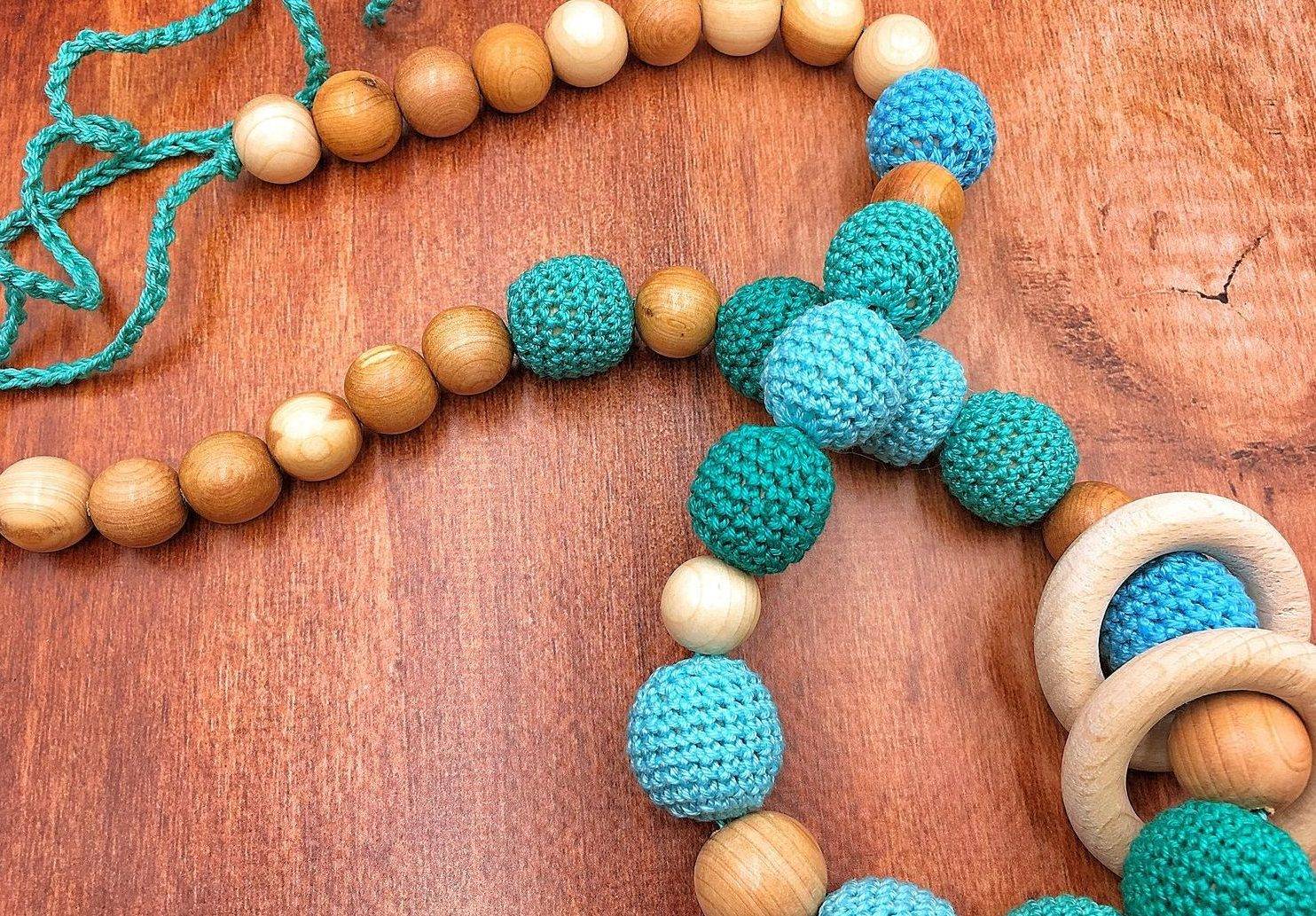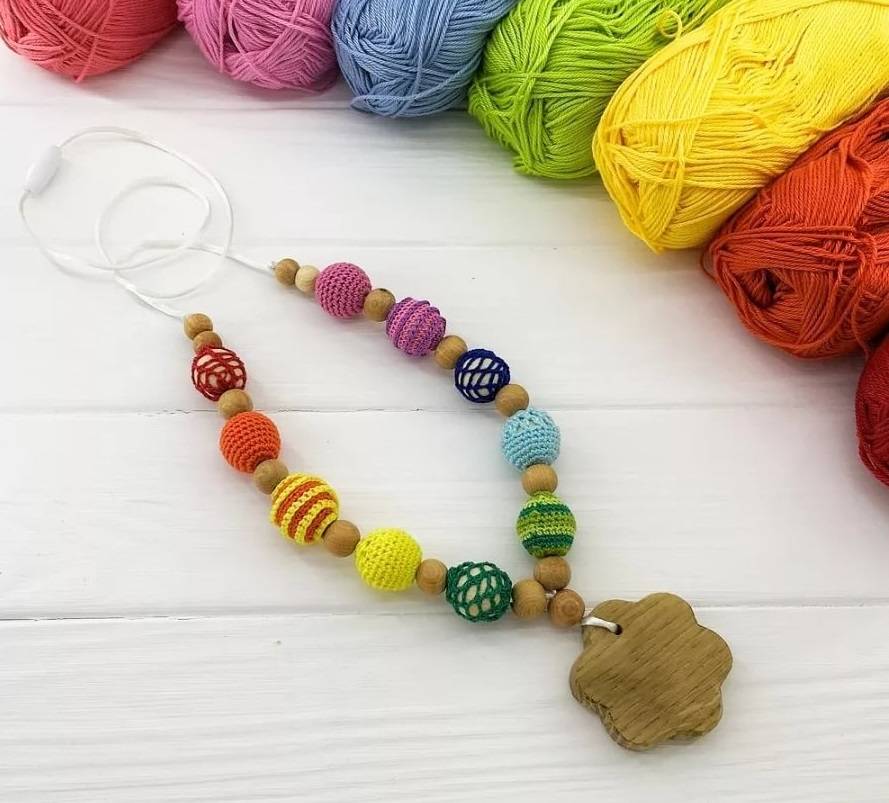 Посвятив несколько вечеров обвязыванию бусин, вы получите практичную вещь, которая станет для вас незаменимой при кормлении, когда крохе нужно ваше внимание. Этот яркий аксессуар позволит решить сразу несколько задач: