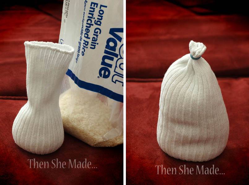 - Наденьте на заготовку с рисом белый носок.