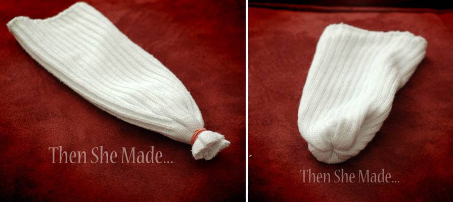 - Снова положите наполнитель и скрутите его резинкой, оставив небольшой хвостик. Это голова снеговика из носка.