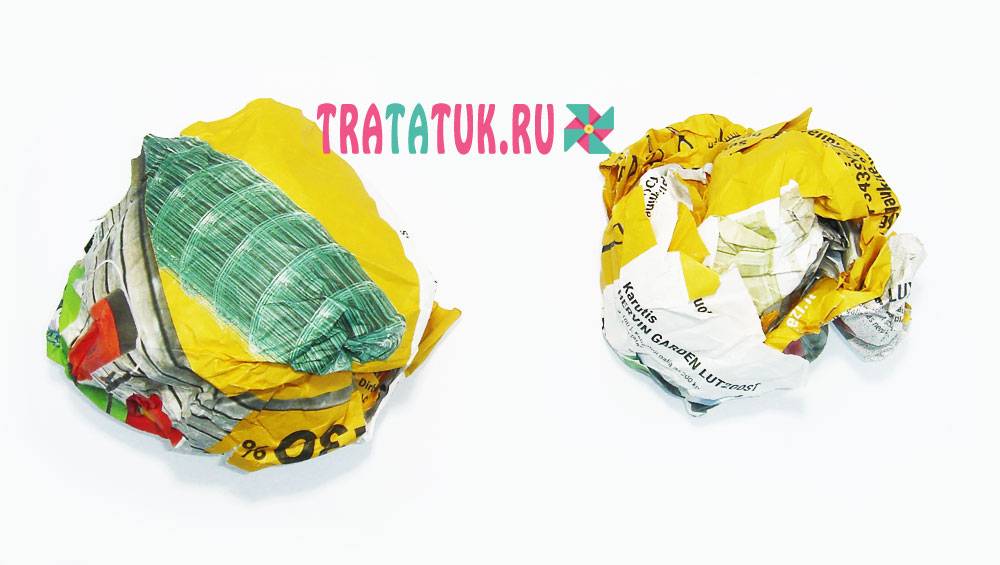 Нужно взять достаточное количество любой бумаги и энергично ее скомкать в подобие шара. Размер зависит от личных предпочтений, само собой, чем крупнее нужна сова, тем больше понадобится бумаги. Один шар побольше на туловище, другой поменьше – из которого будет голова.