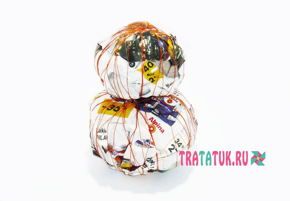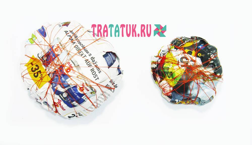 Дальше эти комки желательно немного выровнять, для этого их нужно обвернуть в бумагу и тщательно обмотать нитками, формируя шары.