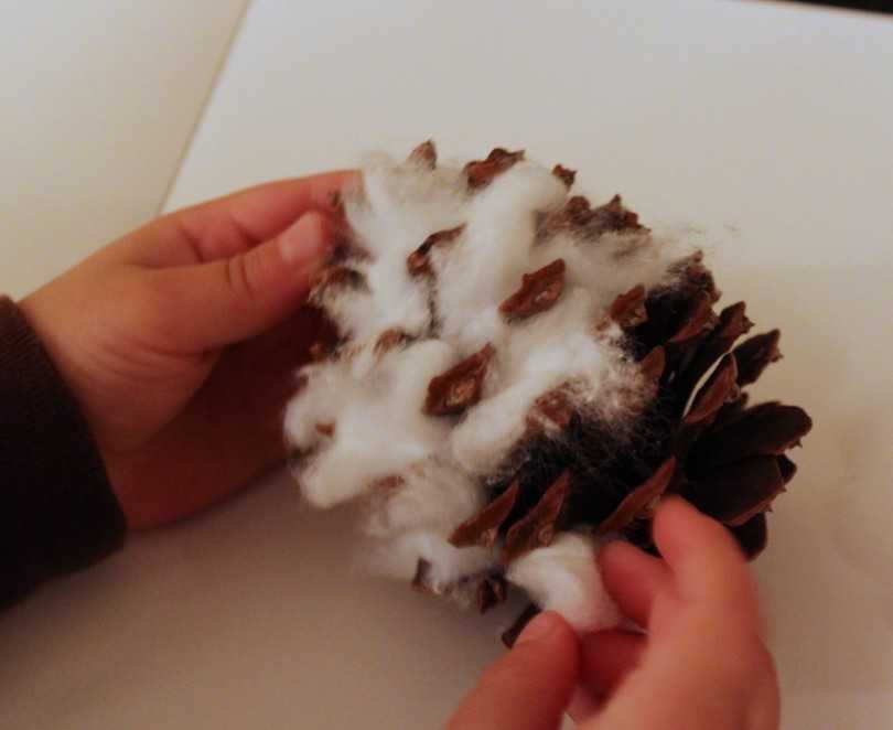 Два элемента скрепляются между собой под наклоном. Сухие стручки фасоли станут лапками, их фиксируют клеем или пластилином. Чтобы сделать крылья нужно сделать боковые прорези ножом в еловом туловище. Вытащить несколько чешуек, и в это место поместить маленькую связку тонких хворостинок. Данный элемент крепится на клей.