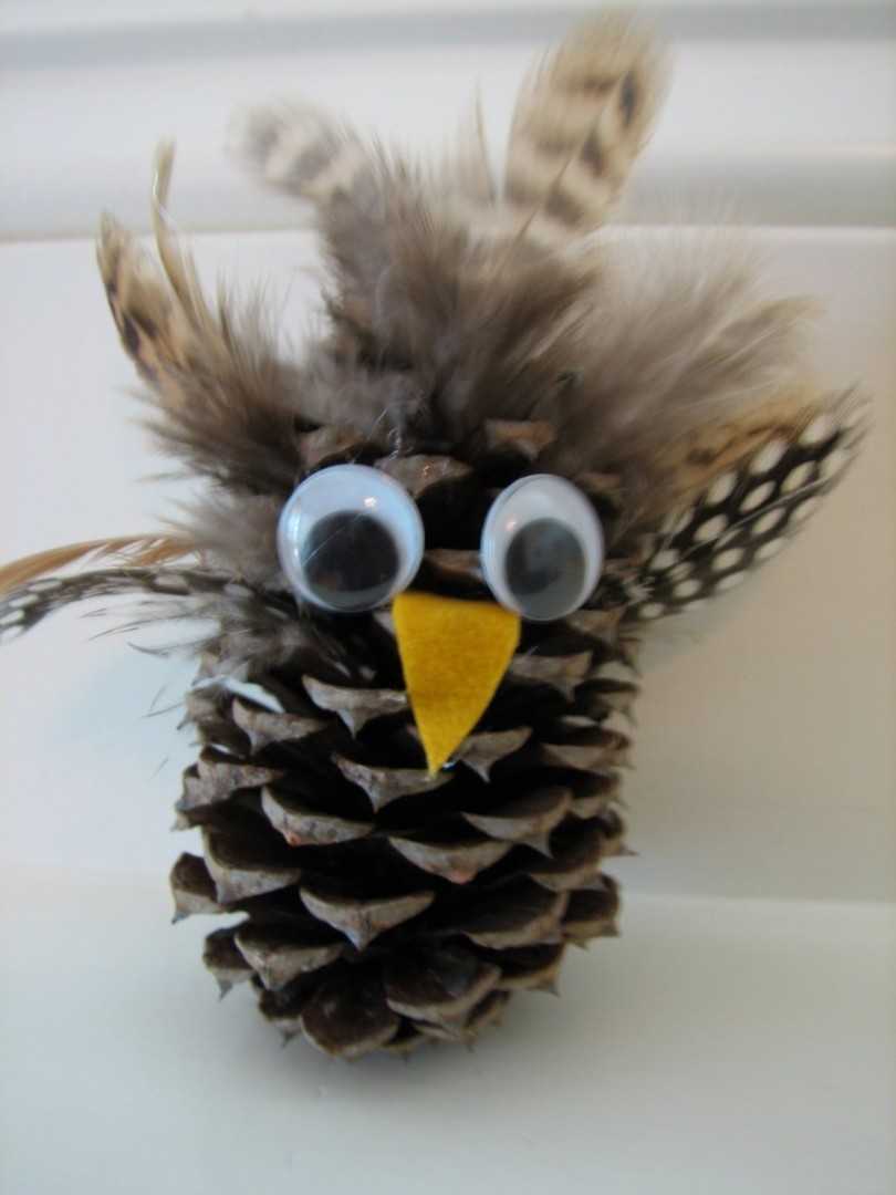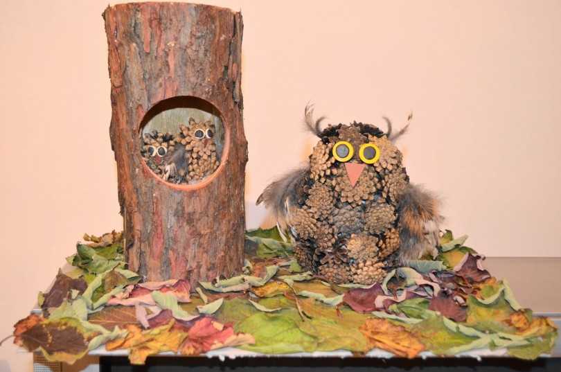 Для глаз делают прорези в шишке. Вставляют их вместе с несколькими тонкими веточками чтобы они служили ресничками, и приклеивают. То же самое проделывают для лапок, но их изготавливают только из сухих веток. Композиция готова, на фото поделки совы получилось очень привлекательное изделие.
