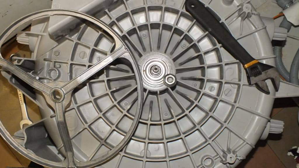 Сначала необходимо провести частичную разборку стиральной машины для того, чтобы уточнить расположение её основных узлов. Чтобы освободить вал, необходимо отсоединить шкив и приводной вал. Часть узлов, которые здесь использовались, для работы гончарного круга не понадобится. Примером здесь может служить, например, таймер у стиралки Индезит. Под стиральным баком в некоторых моделях машин расположен пластиковый диск, защищающий мотор от попадания вводы. Его также необходимо удалить.