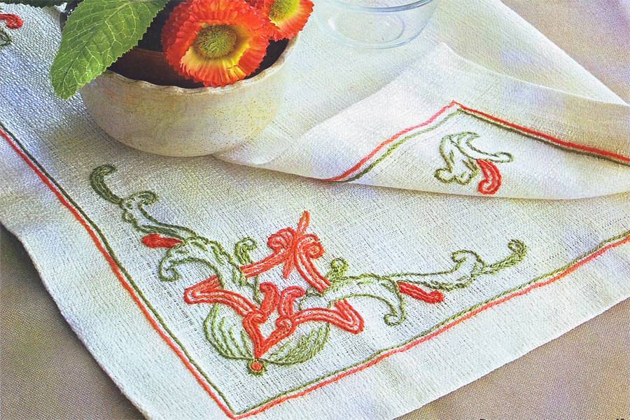 Декоративная контурная вышивка имеет давние корни благодаря простоте исполнения. Шов шнурок, выполненный по прямой, криволинейной линии, помогает рисовать на ткани нитками несложные узоры – цветы, листья и стебельки. Отсюда и произошло его название. Умелицы при помощи таких стежков выполняют уникальные: