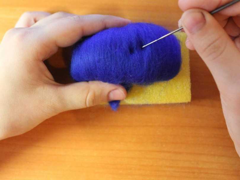 Берут кусок шерсти, кладут на губку и формируют задуманную форму с помощью специальных игл. При этом не следует забывать об усадке сухого сырья.