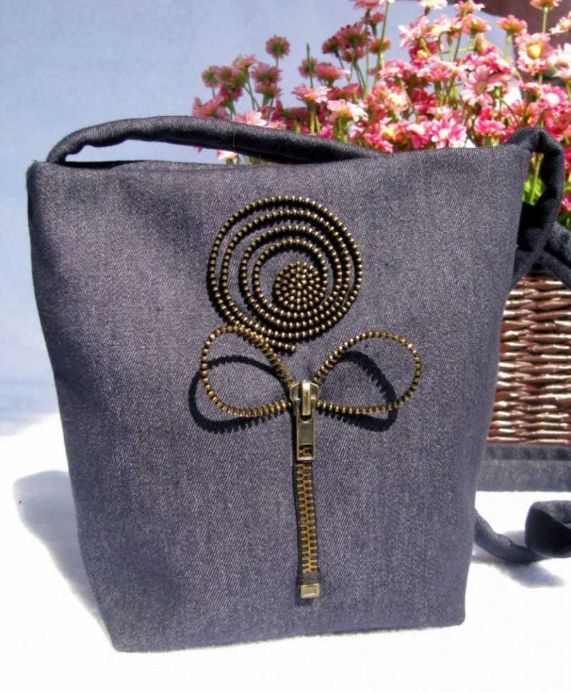 После того как декоративный элемент закреплен, приступаем к сбору сумки. Прострачиваем боковые швы и сшиваем вершины нижних сторон, получим дно сумки. Припуски верхней части подгибаются вовнутрь и приклеиваются также флизелином с помощью утюга. На полученный отворот пристрочить молнию и вывернуть аксессуар лицевой стороной наружу. Дно нужно сложить по принципу конвертика и зафиксировать потайными стежками. Детали ручек нужно сострочить по длинным сторонам, наложив флизелин на одну из них. После этого вывернуть ручки. Бейка потребуется для того, чтобы прострочить ручки с лицевой стороны. Затем пришить их к сумке с изнаночной стороны. Сумка готова к использованию.