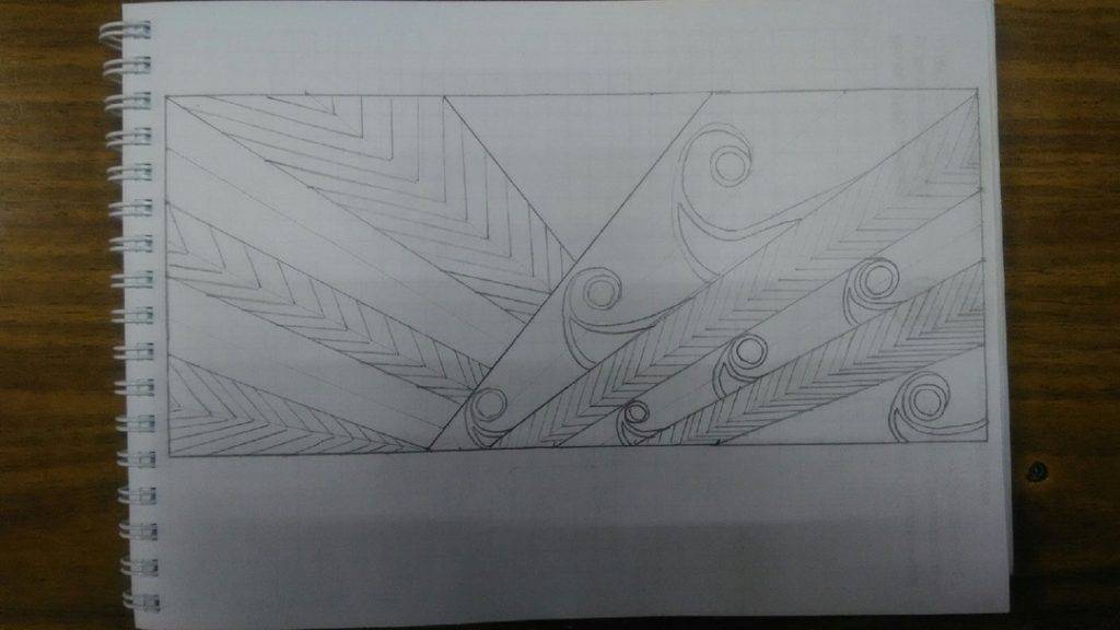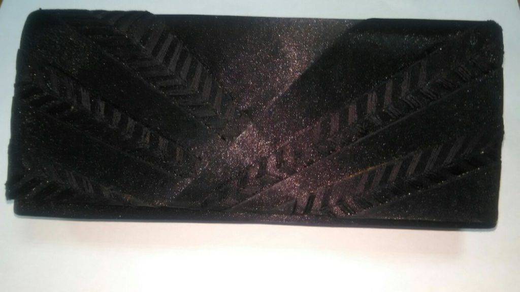 Первым этапом стала разработка дизайна. На изделии уже были диагональные тканевые полосы. Материал клатча – черный атлас. Для оригинальности декора я решила добавить контраст черного с белым цветов. Основной геометрический дизайн дополнила уголками по направлению полос. В шахматном порядке добавила плавные завитки и круги, чтобы смягчить строгий стиль клатча.