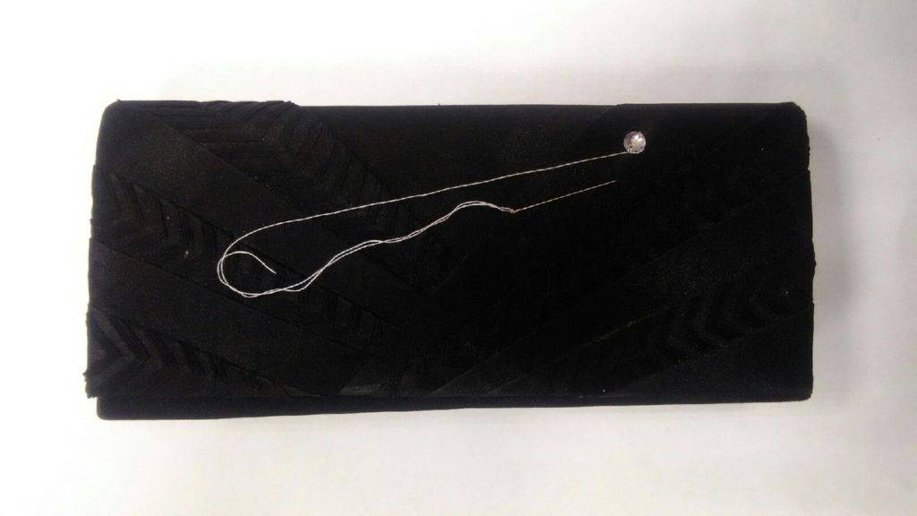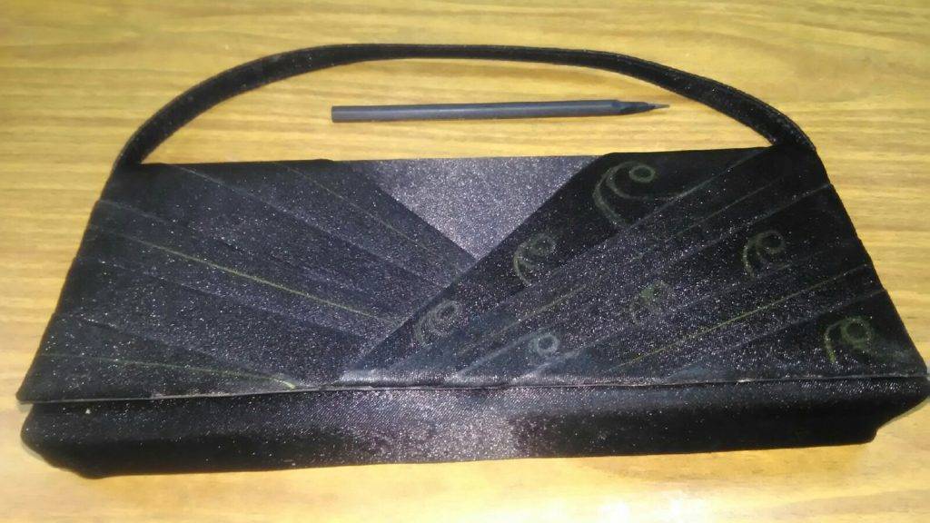 Чтобы сделать вышивку сумки еще оригинальнее, я использовала мулине черного цвета. Основная ткань аксессуара – глянцевый черный, поэтому матовость мулине придаст фактуру клатчу. Декор начала с верхнего сгиба сумки, техника вышивки – гладь. Края стежков прикреплялись в складках потайным стежком.