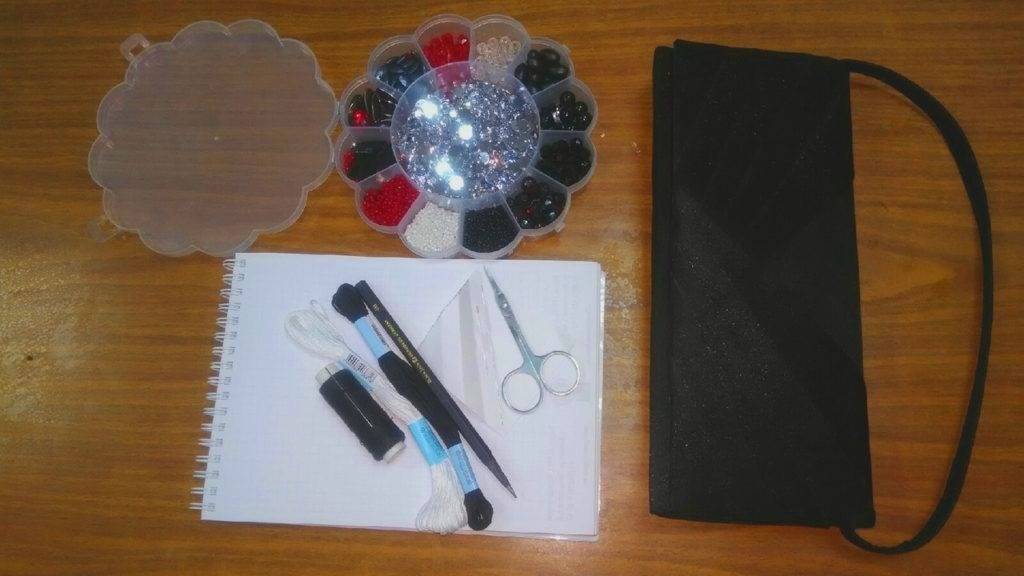 Пустоты белых завитков на правой верхней диагональной линии заполнила рядами черного бисера. Для вышивки использовала короткую иголку для бисероплетения. Она с легкостью проходила в бусинки и не деформировала нежную ткань атласа.