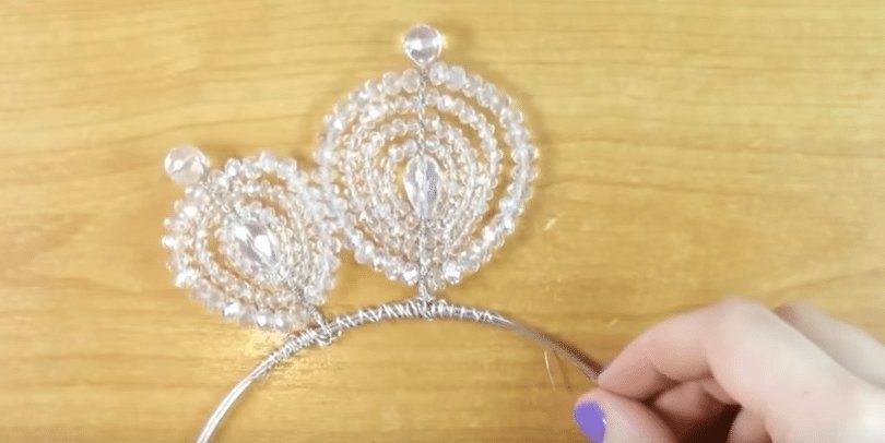 Закончив создание всех элементов диадемы, прикрепляем их к ободку. Аккуратно прикручиваем детали, начиная с центральной части изделия.