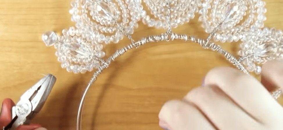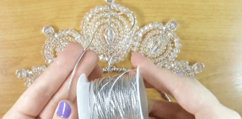 Чтобы бижутерия засверкала, нужно хорошо спрятать некрасиво выступающую проволочку. Сделать это можно с помощью серебряной нити, просто обвивая ею ободок.
