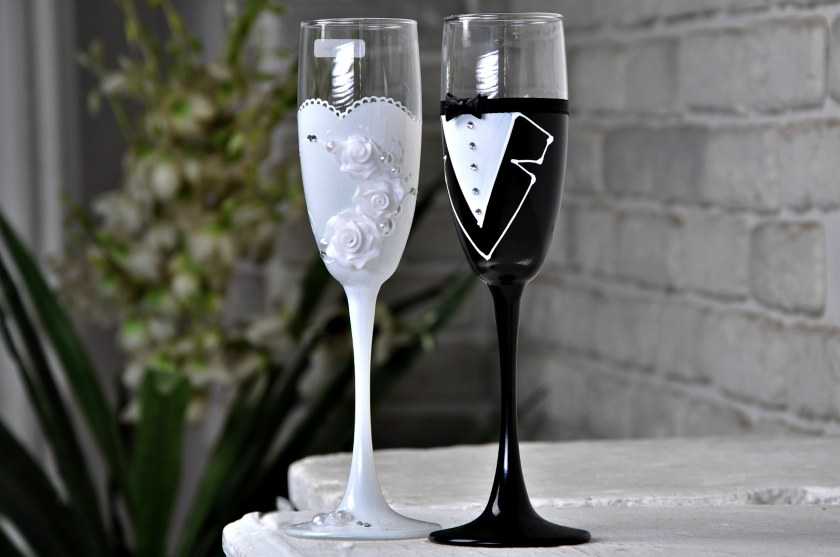 Можно дополнить ее бантами или бусинами – здесь уже работает фантазия. Получается скромный, но со вкусом украшенный бокал, который подойдет для любой свадьбы, как роскошной, так и в кругу друзей.