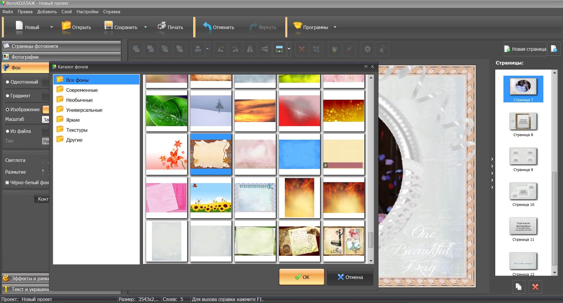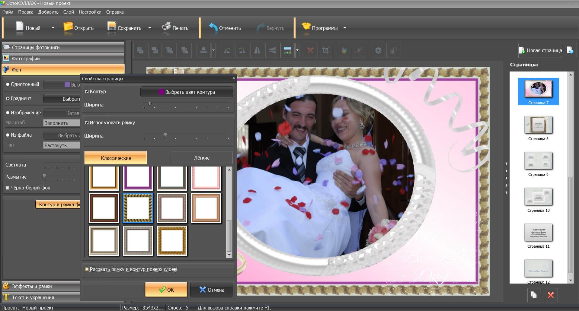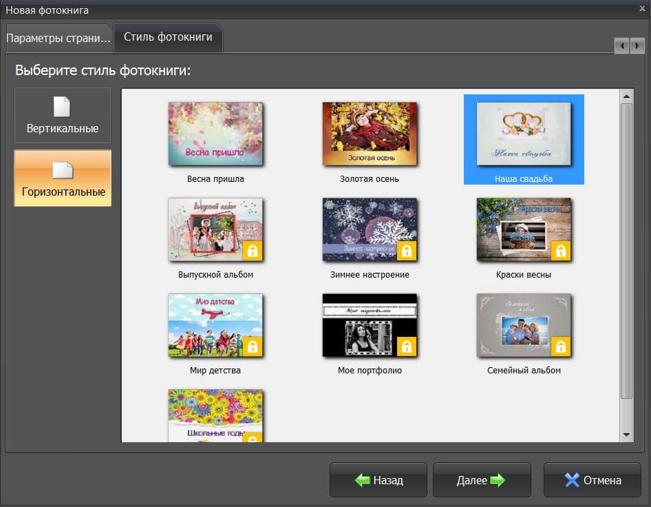 После того как вы установили параметры страницы, перед вами откроется окошко с выбором стиля. Для начала определитесь какой будет свадебная книга: горизонтальной или вертикальной? Свадебный шаблон находится в правом верхнем углу окошка. Нажмите на него и снова кликните по кнопке «Далее».