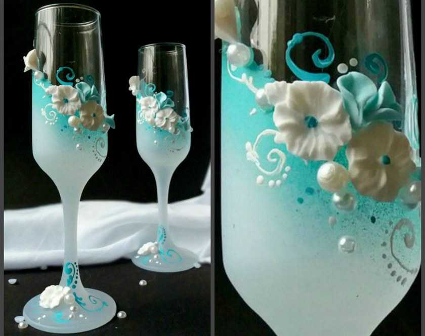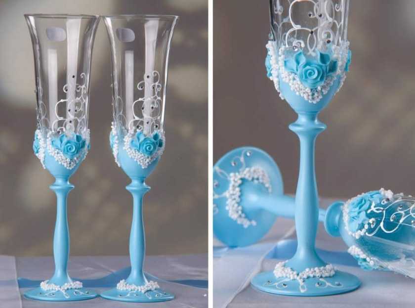 Их часто применяют для декора, потому что процесс создания бокала очень прост. Можно взять белые атласные ленты средней ширины и обернуть ими бокалы. Дальше сверху выкладываем и приклеиваем небольшую нитку, на которую нанизаны белые бусины (цвет можно менять).