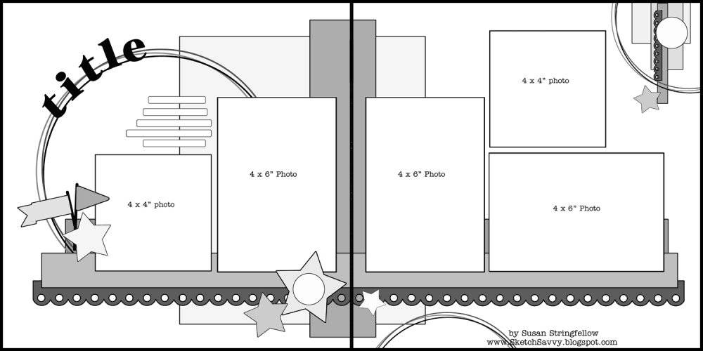 Такой скетч идеально подходит для разворота, звездочки и кружочки заменяются на многослойные цветы и полу бусины. Полосы с ажурным краем – либо кружевная лента, либо полоска бумаги, край которой обработан специальным краевым дыроколом.
