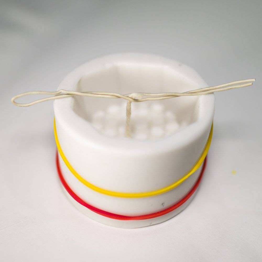В готовой силиконовой форме уже сделано отверстие для извлечения фигуры. Туда и аккуратно заправляем фитиль (посередине), не разрывая форму. Резинками скрепляем форму, чтобы воск не вытек. Далее закрепляем фитиль в зажиме из проволоки и центрируем по диаметру формы, регулируя натяжение.