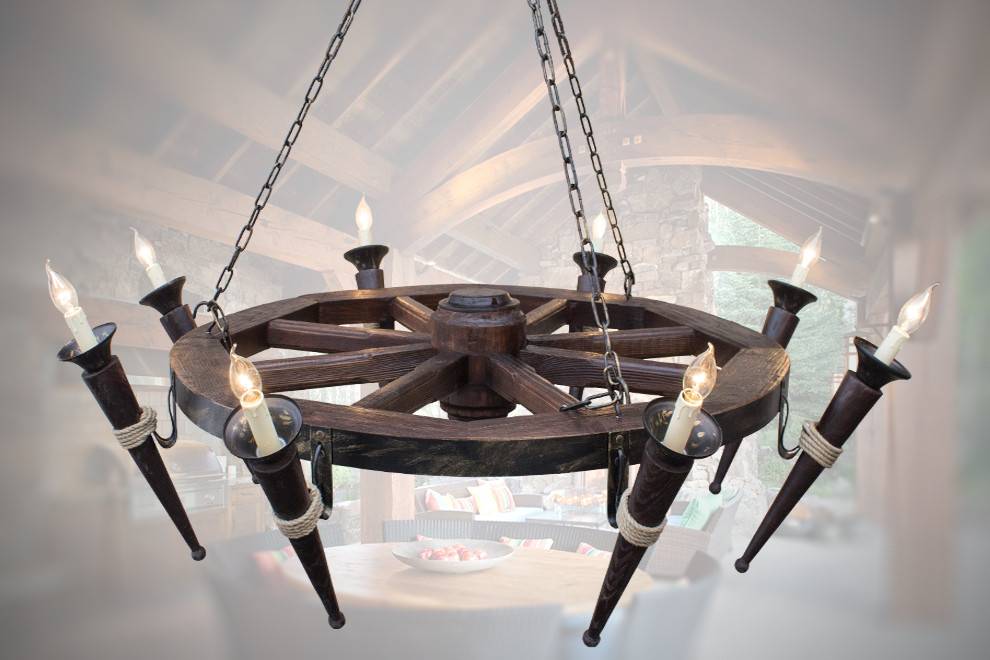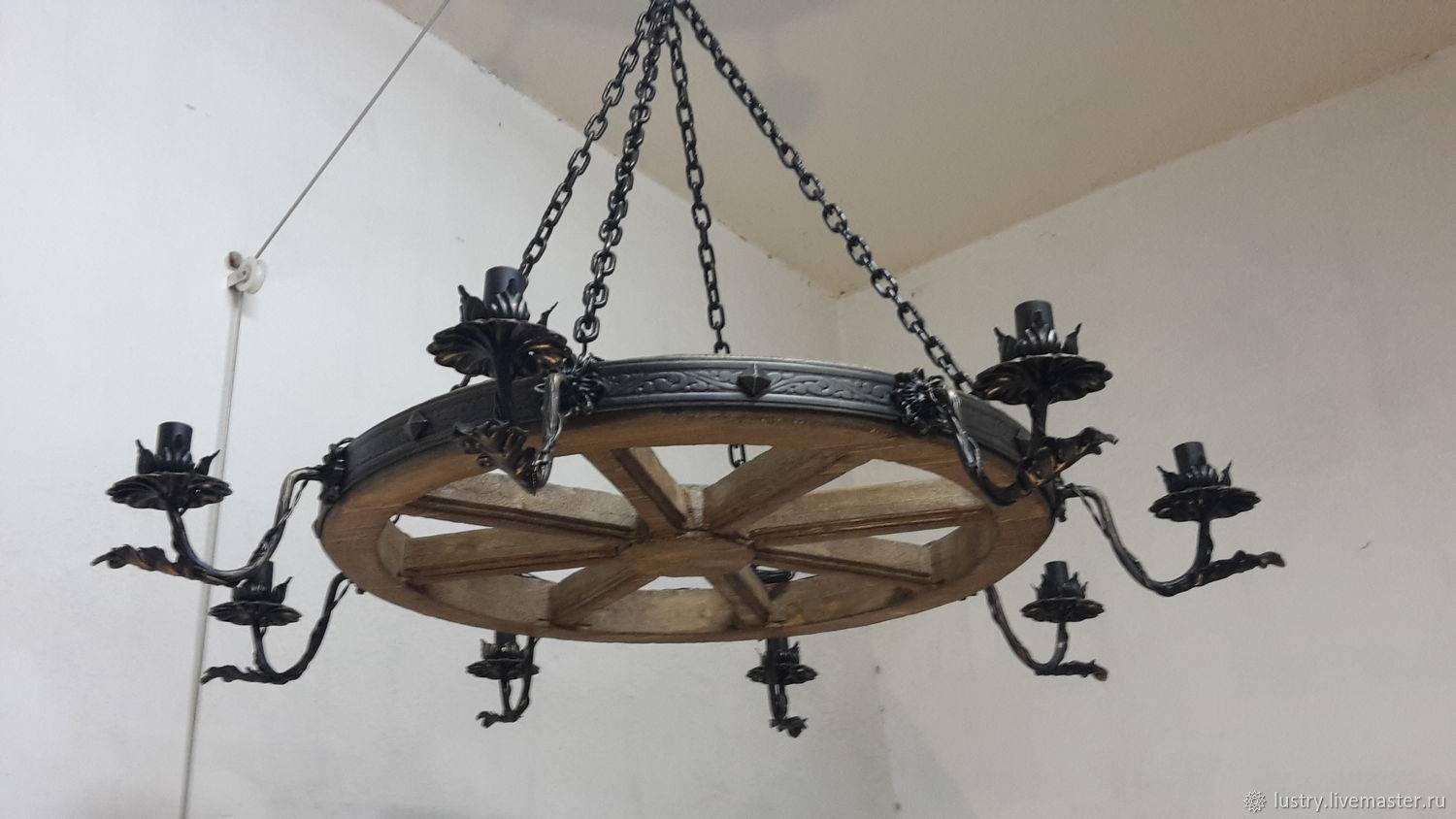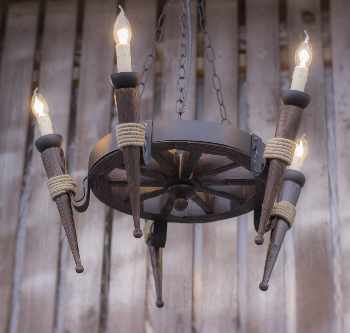 Если вам повезет найти колесо от телеги, то из него вполне можно сделать вот такую люстру.Это не очень сложно. Колесо мне попалось не очень новое и даже слегка подгнившее. Оно валялось за сараем на свежем воздухе и слегка того…Но, оно и к лучшему. У нашей люстры станет бывалый вид, вполне уместный в деревенском доме.Отчистив колесо от грязи и ржавчины, я прокрасил деревянные части пропиткой с эффектом подрашивания (полисандр) Годится любая, но мне попалась «Здоровый дом»Затем, слегка надсверлив ввинтил крючки, за которые люстра будет подвешена. Три штуки. По ободу они расположились через 120 градусов.Потом, все металлические части я покрасил черной нитро-краской (не знаю, от запаха ли этой краски, или от выпитого коньячку, но у меня разболелась голова