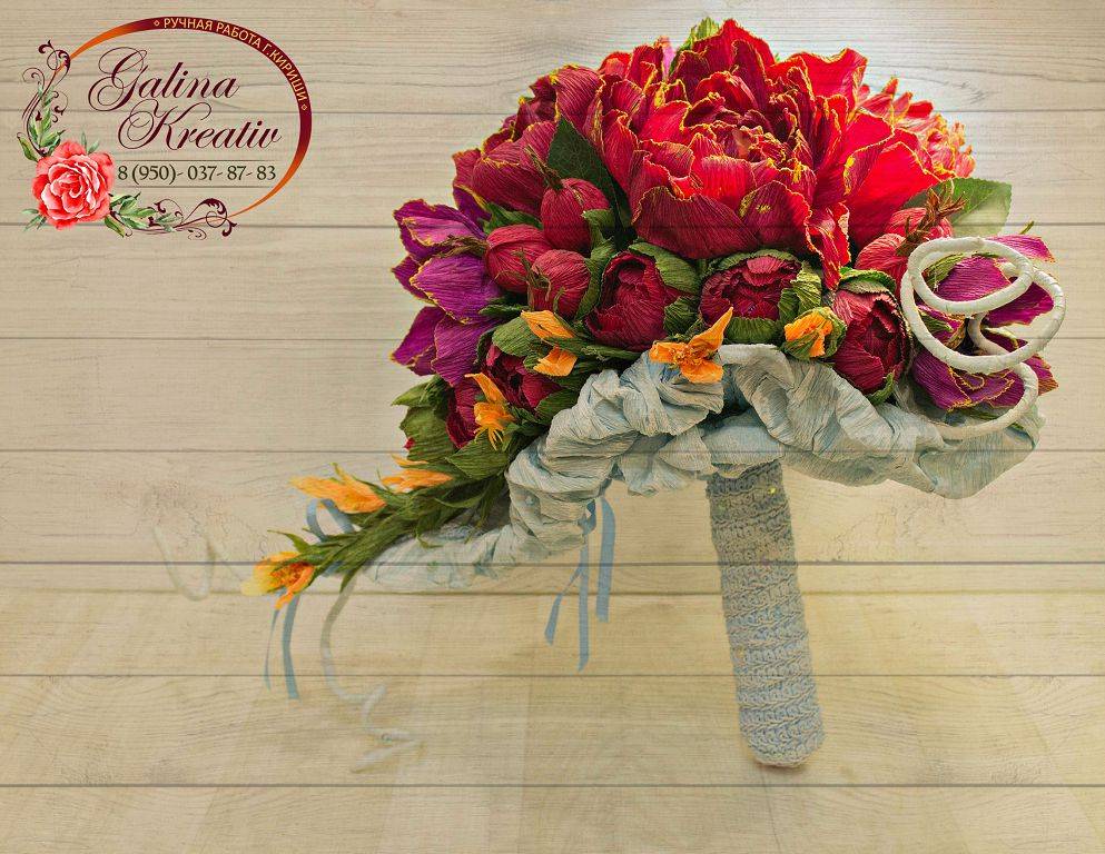 Букет с искусственными цветами из гофрированной бумаги подойдут по любому поводу. При оформлении формируются глубокие бутоны, внутрь которых вставляют круглые шоколадные конфеты. Для таких случаев чаще используют не развесные сладости, а те, которые продаются в коробках.