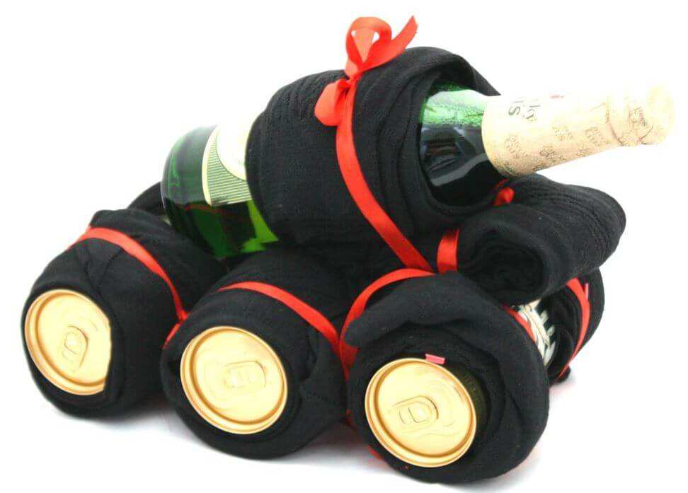 Праздничный танк можно изготовить как из одних лишь носков, так и с использованием второстепенных предметов, таких как, например, банки из-под напитков. А те, кому кажется, что одного лишь подарка из носков недостаточно, могут подарить вдобавок всеми любимый гель для душа или пенку для бритья, красиво оформив ансамбль, сложив подарки и поздравительную открытку в корзину или яркий пакет.