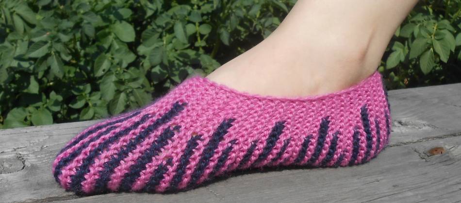 Изготовление такой домашней обуви выполняется цветным узором, ленивым жаккардом: