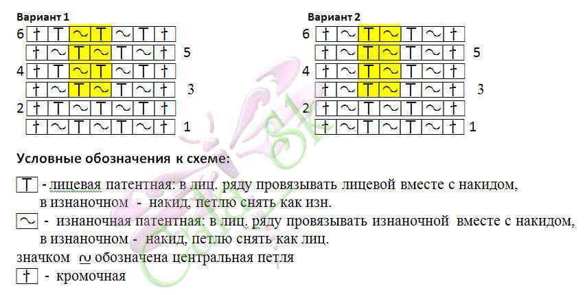 резинки,1-й вариант – символы изображены с учетом поворота полотна (двустороннее вязание), на второй схеме петли изображены так, как они выглядят с лицевой стороны (круговое вязание)