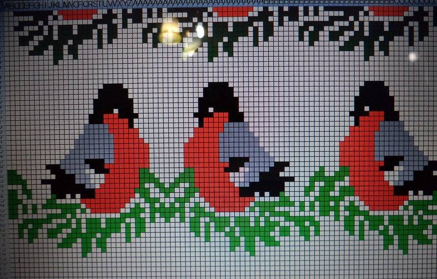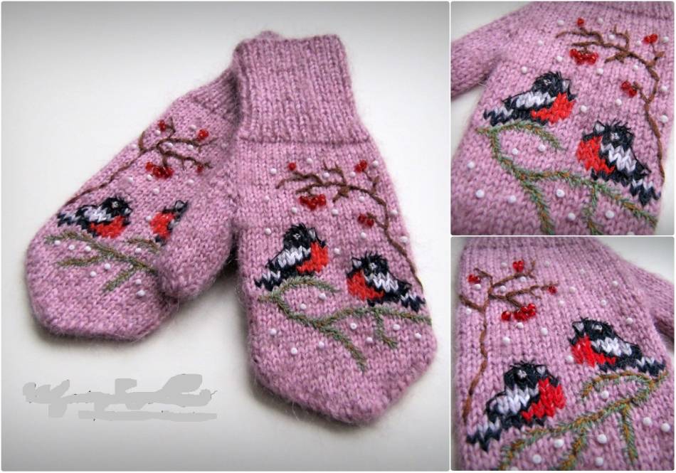 Одни из зимних птиц, что остаются с нами в холода — это снегири. Даже если у вас зима мягче, теплее и без них, свяжите ребенку варежки с их портретом.