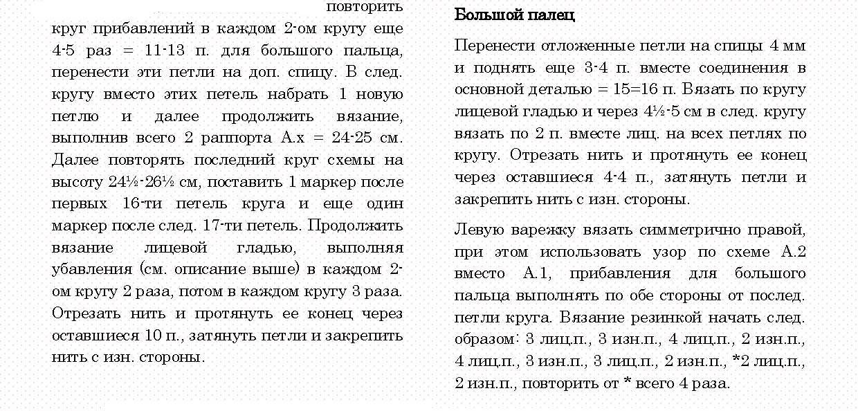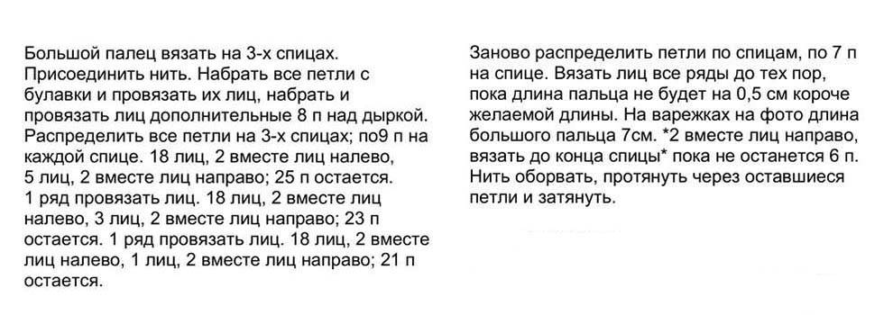 - с 10-го ряда прибавляйте петли для ответвления большого пальца — 2рх3п, 3рх3п, 2рх3п. Все их выполняйте лицевыми,