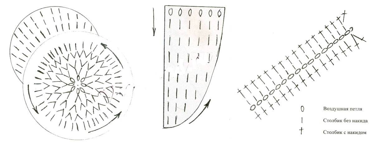 (начало), а на второй и четвертой спице вяжем по 2 совместные петли за 2 верхние доли (конец). - На каждой спице уменьшаем количество звеньев (через ряд),