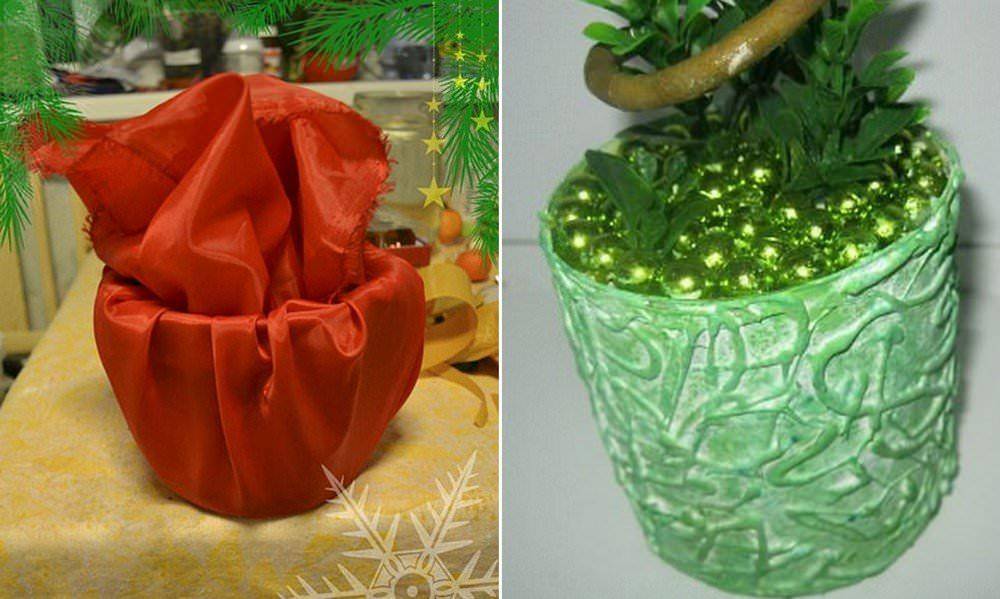 Кашпо для топиария можно украсить любым декором, который есть под рукой. Это может быть текстиль, шпагат, гофре и многое другое
