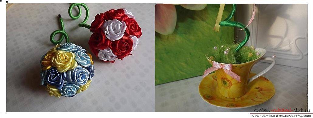 Атласный топиарий . Для изготовления используются атласные ленты. Данная разновидность одна из самых популярных, и ниже мы приведем мастер-класс с пошаговой инструкцией.