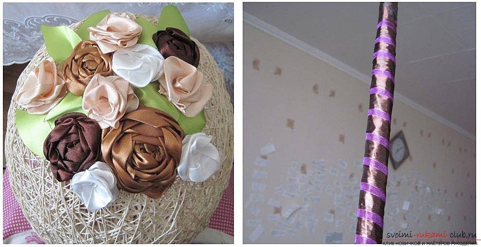 Дополнительно стержень обматывают атласными ленточками, тесьмой, декоративной бумагой, деревянную основу можно просто покрасить.