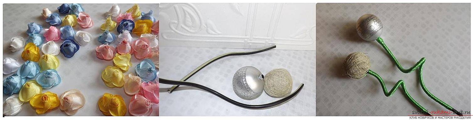 Собирать такой топиарий своими руками достаточно просто. С помощью горячего клея надеваем на ствол пенопластовый шар, который заполняем получившимися розами из атласных лент.