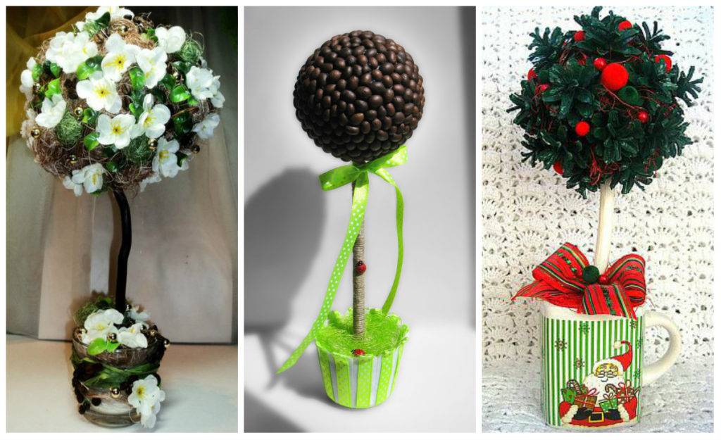 Топиарии также называют «дерево счастья». Это компактное декоративное деревце, изготовленное из натуральных или искусственных элементов. Как правило, такие поделки имеют круглую крону и небольшой тонкий ствол.