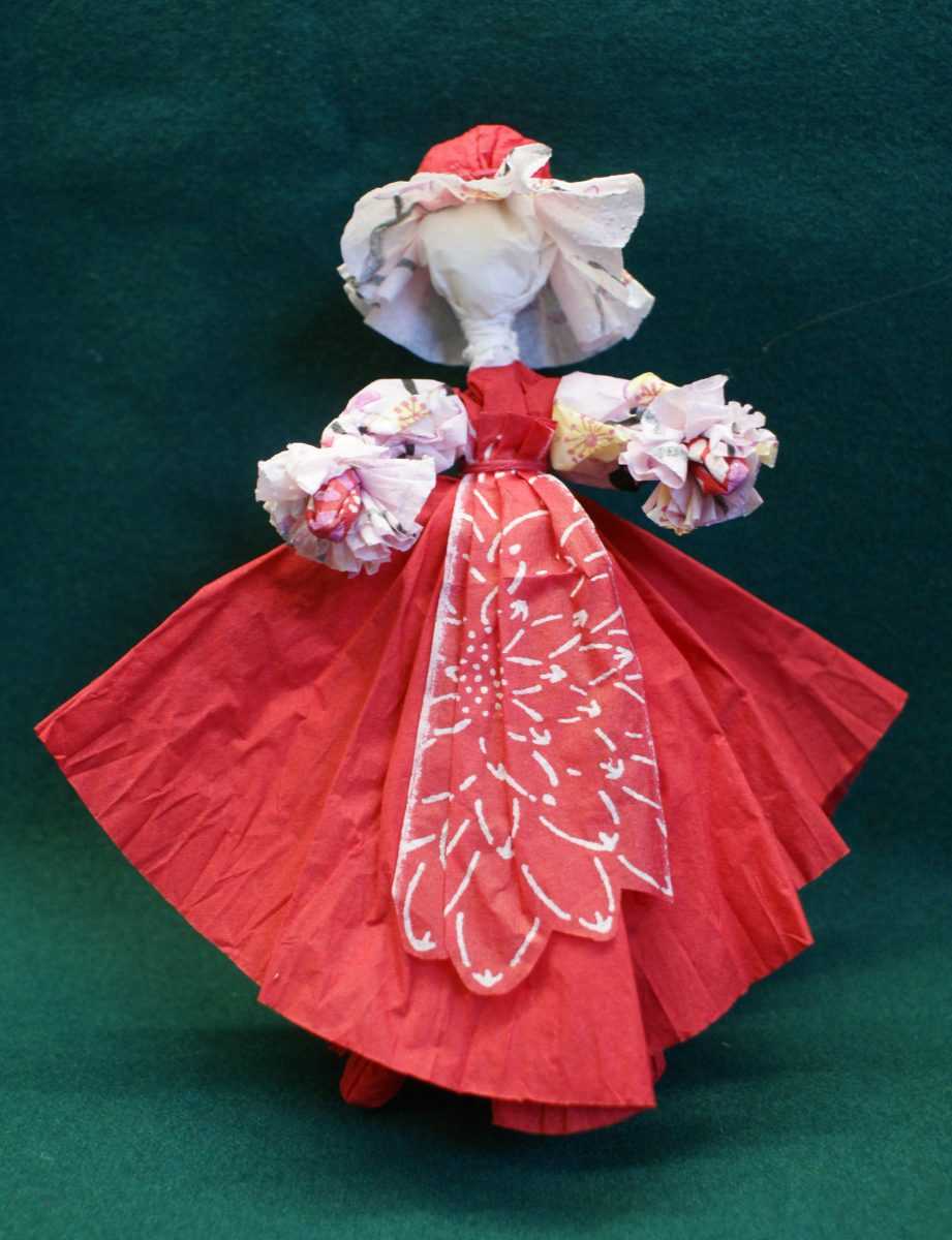- Оставшаяся салфетка играет роль головного платка. Ее фиксируют капелькой клея под «подбородком», затем расправляют.