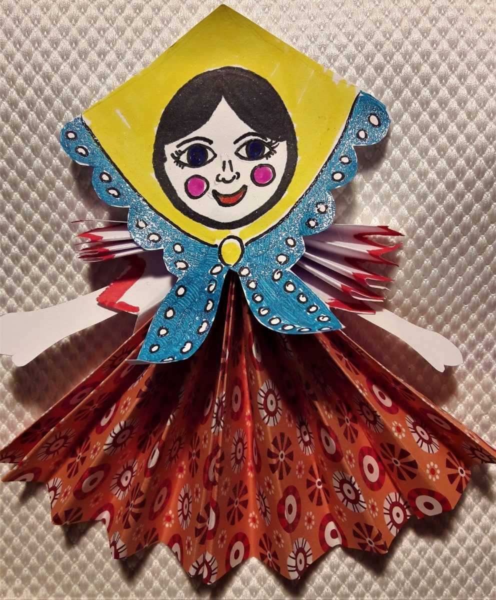Удобно и просто использовать несколько салфеток разного цвета для создания куклы-маслены. Она отлично подойдет для тематической поделки из бумажных салфеток для домашнего творчества.