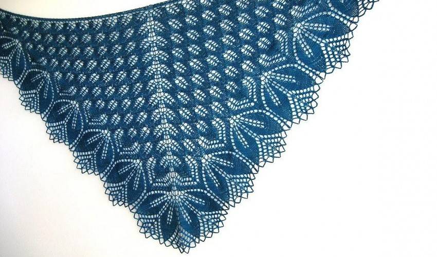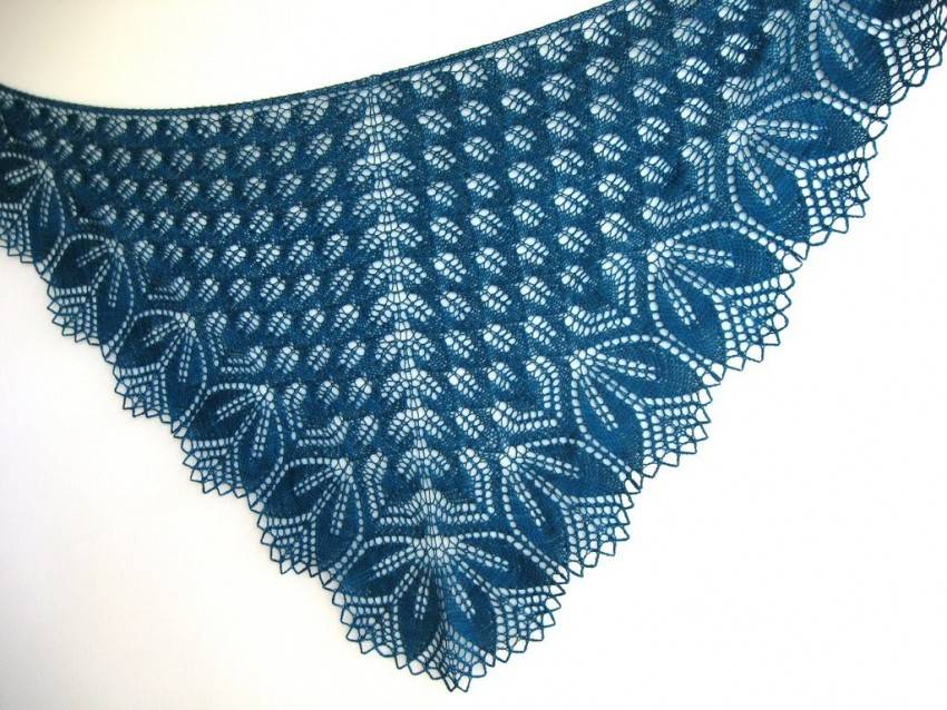 Отличительная черта вязания шали с двойной каймой – листочки второго яруса формируются из последнего ряда первого, образуя замысловатый зигзаг по бокам и в центре.