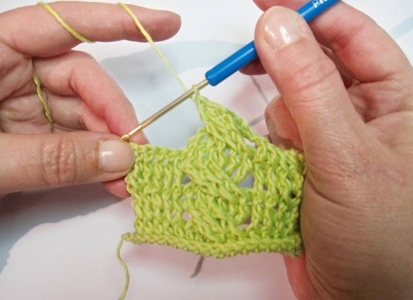 - Первый ряд вяжут 5 воздушными петлями, после чего повторяют узор по схеме трижды и закрывают ряд столбиком с накидом.